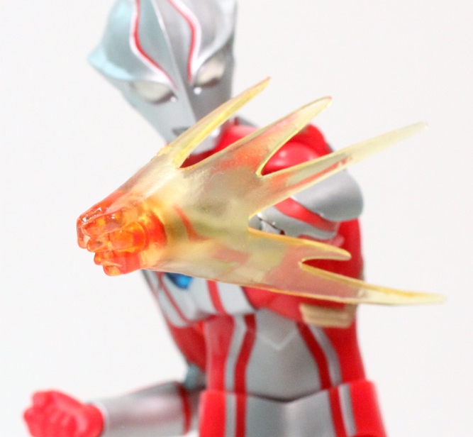 Mebius comes with two extra sets of hands, an action punch, hand ray, as well as a sword that swaps out on his removable wrist piece on the left arm.