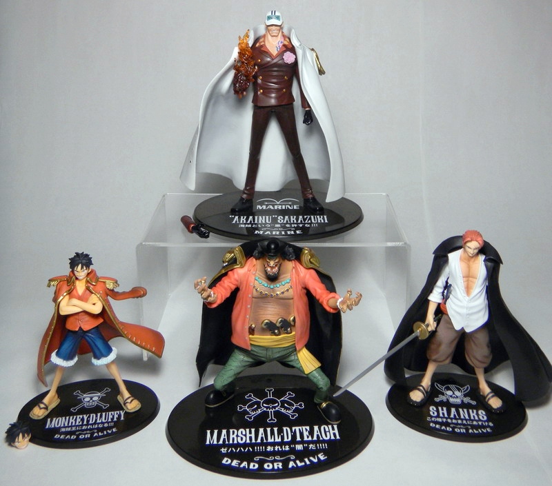 PAINT: As far as painted details go, al of these figures are decorated with a very high level of precision and detail. The most impact color techniques are visible in Marshall D Teach and Akainu which feature dry-brushing details and multiple color shading which enhances their three-dimensional form. Akainu’s magma-covered hand is colorized beautifully with a vivid blend of translucent reds and yellows which give the impression of realistic flames. The colors on Monkey D Luffy and Shanks are also applied with precision and accentuate each anime character’s three-dimensional representation.
