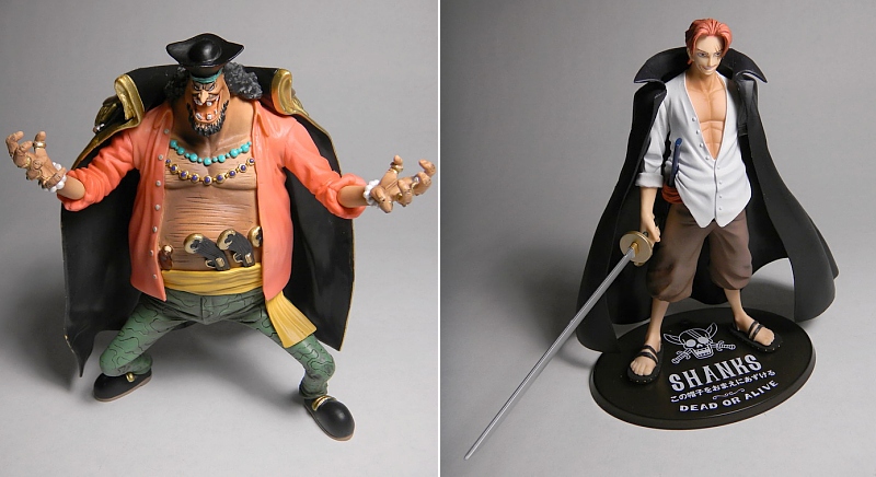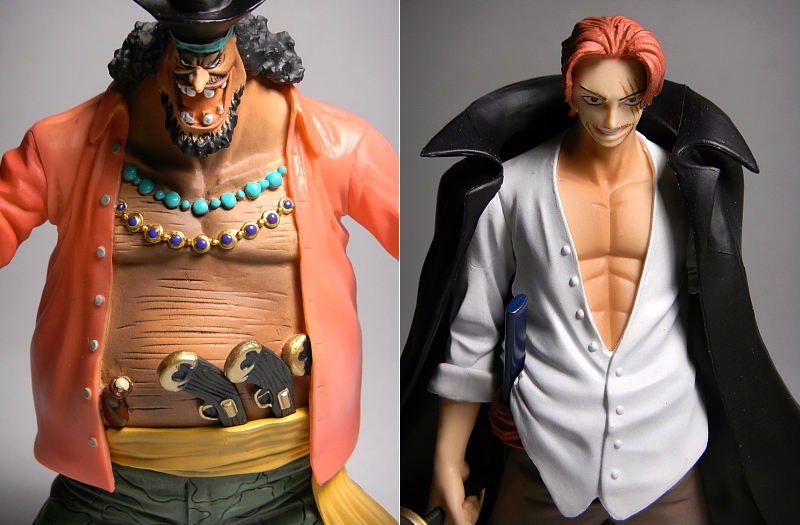 The Red-Haired Pirate Shanks, stands at the ready with saber in hand wearing a black cape which conceals his missing left arm. The sculpted wrinkles on Shanks’ garments and chiseled upper body is rendered very well in three-dimensional form. The enormous Marshall D Teach, aka Blackbeard, is one of the most stand-out figures in the series and features extensive detailing all around. The figure includes a removable black and gold captain’s coat which rest easily on his shoulders for display variations. There is a lot of visible details on this characters which make him more visually appealing such as the three pistols and dagger he carries stored in his yellow sash and his creepy ring-covered hands.