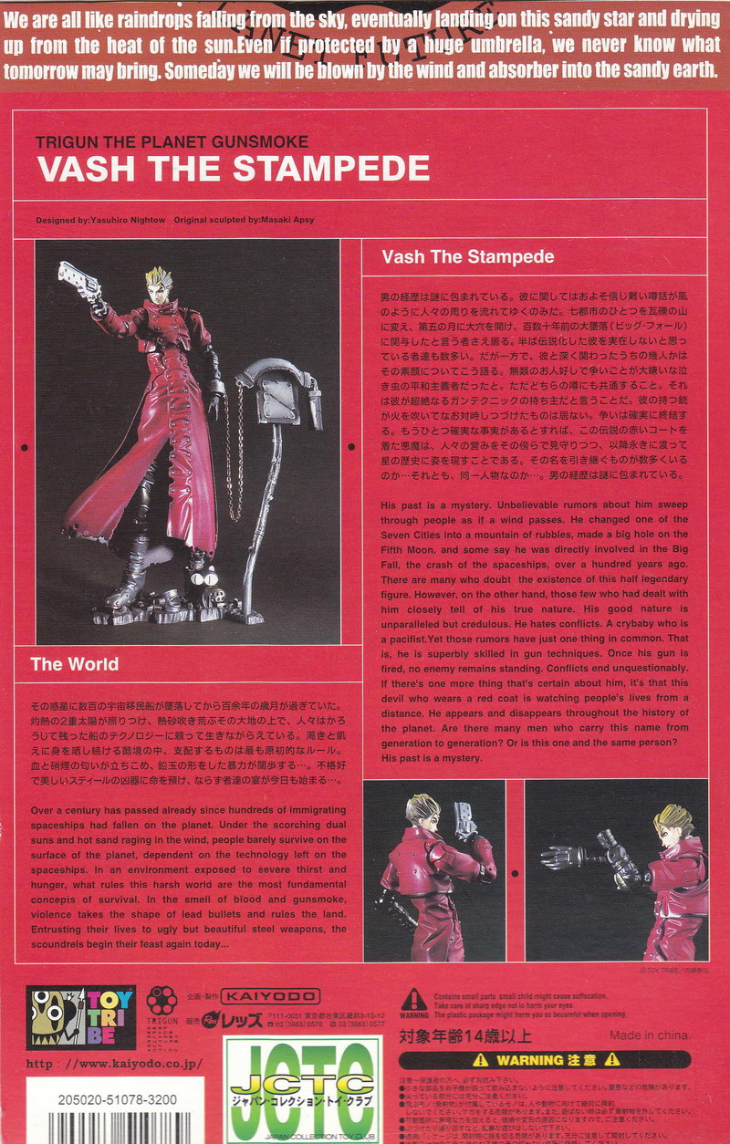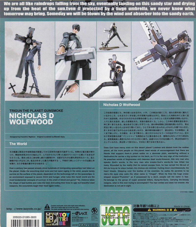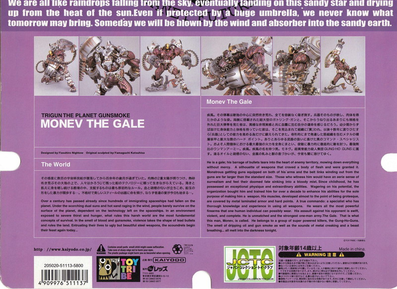 Back in 2000, Kaiyodo introduced a new series of action figures under their Toy Tribe banner which included characters from the anime and manga Trigun, as well as original creations from its creator, Yasuhiro Nightow. These figures were so ahead of their time in terms of sculpt and articulation that even today they rank as amazing collectibles. Monev the Gale is one of my all-time favorite toys, the massive figure oozing with tons of good looks and just an insane amount of poseability. These figures were so incredible that only Kaiyodo itself was able to top the line with recently released Revoltech Yamaguchi figures of Vash and Wolfwood (read our reviews HERE and HERE). Here's hoping they remake Monev as well, though I am unsure how they could possibly improve on the first figure.