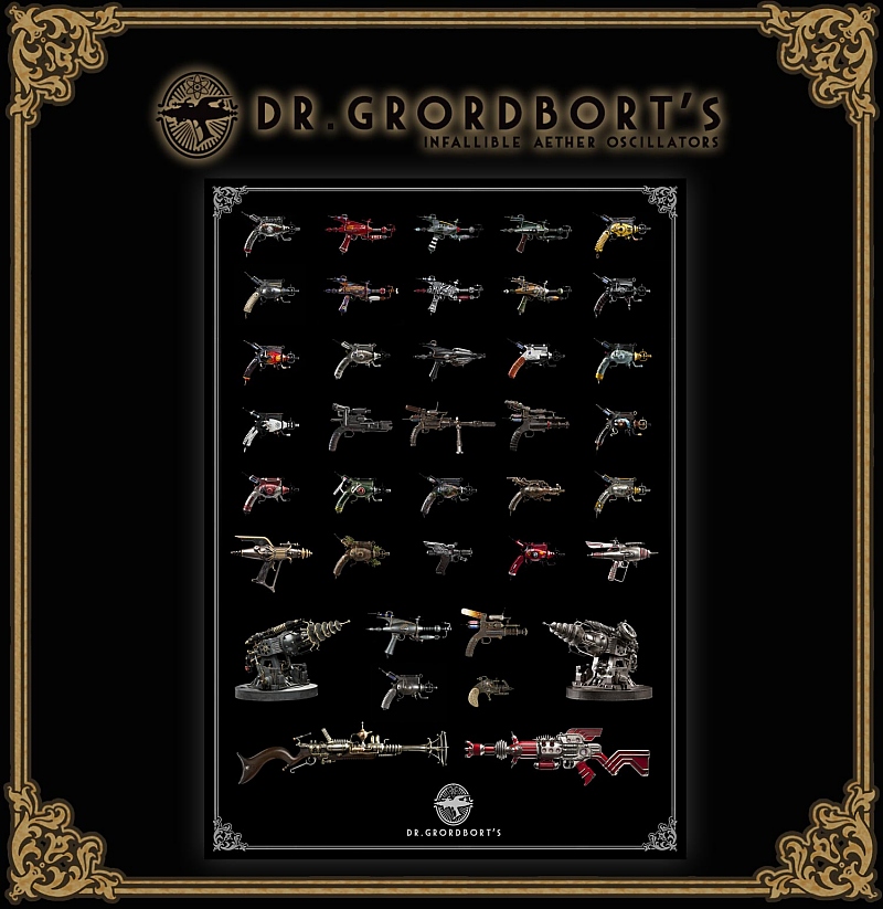 To help catalog your Dr Grordbort Raygun collection, Weta is also offering a poster featuring every full size raygun made so far. Some are familiar, others less so. Sputnik to Space Shuttle. Green Ghost to Crimson Curse. Starburst. Kraftig. The poster measures 16.5 x 23.4 inches and is priced at $13.99.