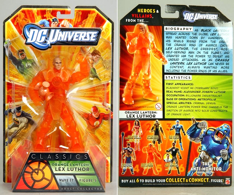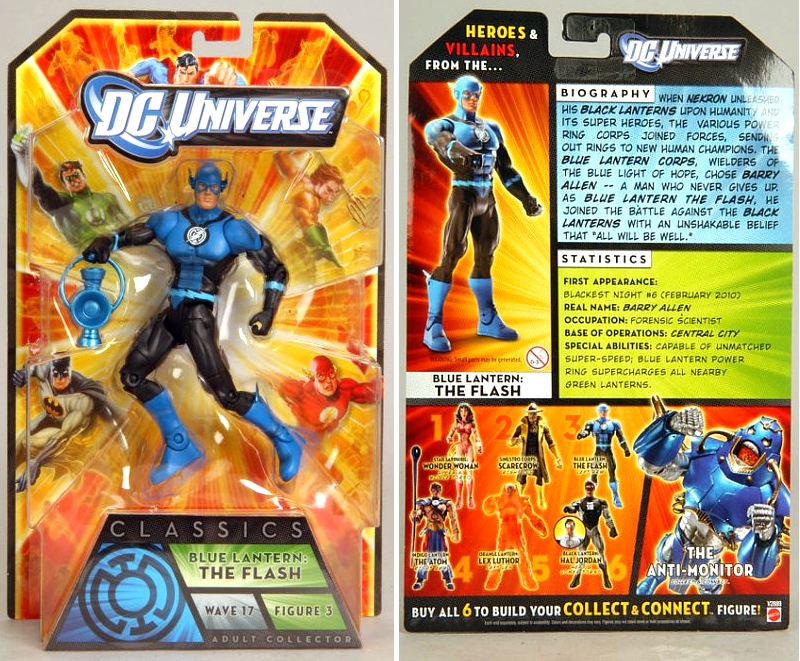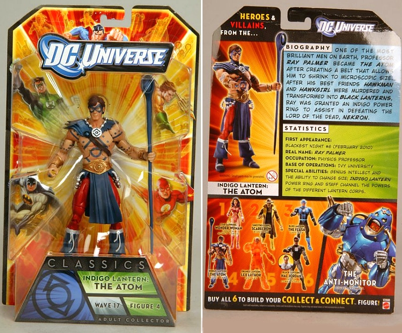 Mattel provides a packaged look at their latest assortment of DC Universe Classics: Wave 17. Themed after the Blackest Night story line, this Lantern filled series includes Indigo Lantern Atom, White and Black Lantern Hal Jordan, Blue Lantern Flash, Orange Lantern Lex Luthor, Sinestro Corps Scarecrow, and Star Sapphire Wonder Woman. Get them all to build your very own Collect-and-Connect Anti-Monitor. Look for DCUC 17 this summer.