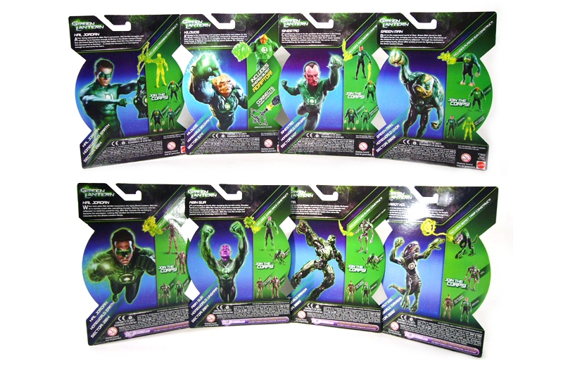 It’s not hard to find the Green Lantern section at the store, seeing as how it’s a sea of green! For these basic figures, Mattel went with a pretty cool package design that’s functional and attractive. It’s a standard bubble and card layout, with the cardboard in the general shape of the Green Lantern symbol. There’s lots of green with a dark border around the whole thing, a band including the GL oath around the bubble, and the GL symbol on white behind the bubble. The movie logo appears at the top of the card, and an illustration of Hal Jordan flies out of the bottom, his fist connecting with the included GL ring in the bubble (a nice touch). At the very bottom-left corner is the number and name of the specific figure who can be seen in the central bubble along with his/her/its accessories.