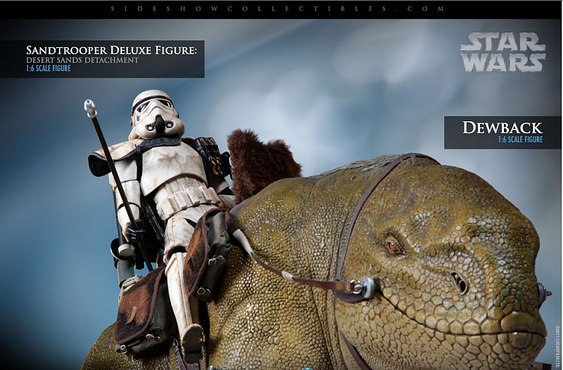 This is one of those announcements that kind of takes your breath away - a 1:6th scale DEWBACK is coming from Sideshow Collectibles. That's one BIG lizard. Not only that, but a new 12" Deluxe Sandtrooper is being released to ride it. Both figures, to be sold separately, will be offered for pre-order Thursday, May 26th. Expect a full reveal early next week.