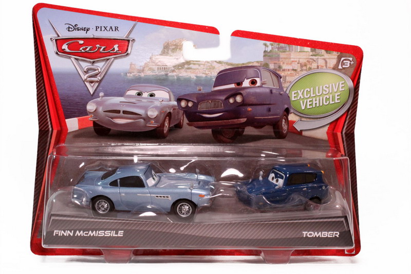 With CARS 2 speeding towards a theatrical release June 24th, Mattel is hoping to capture “Lightning (McQueen)” in a bottle once again. The CARS 2 product line follows the original release pretty closely with a slew of single pack cars and also two-packs. Finn McMissile (played by Michael Caine) is available as a single carded car but we’re looking at this two-pack because it comes with an exclusive character: Tomber.
