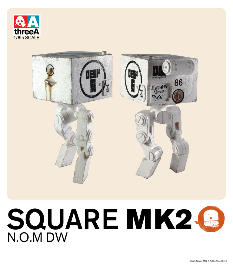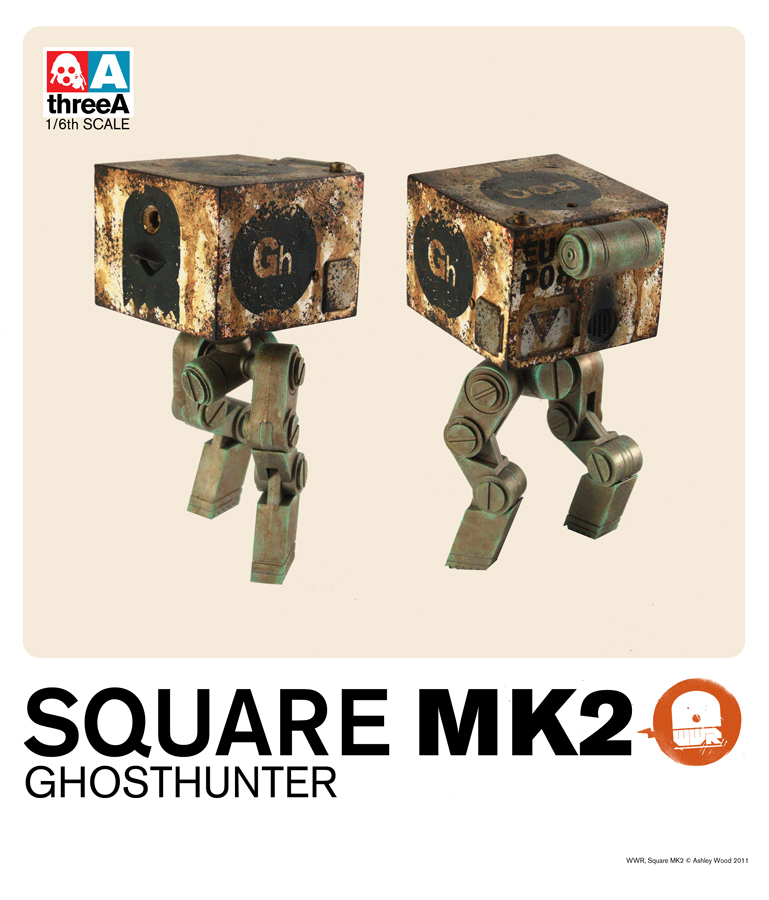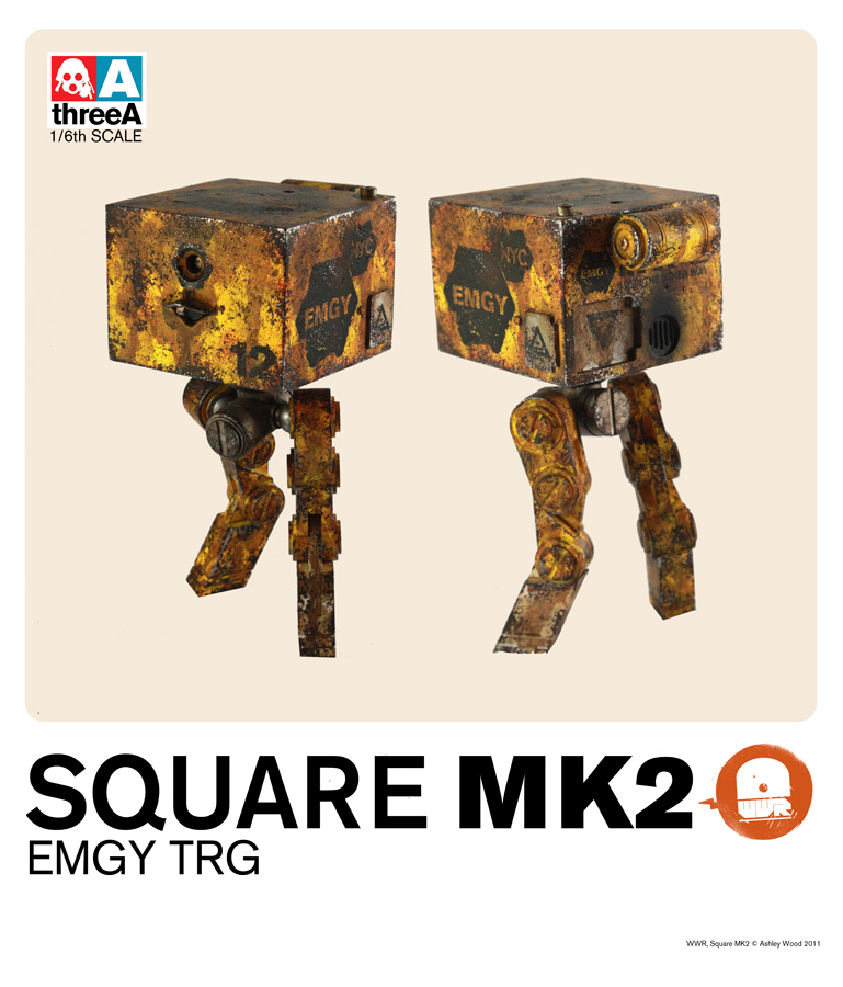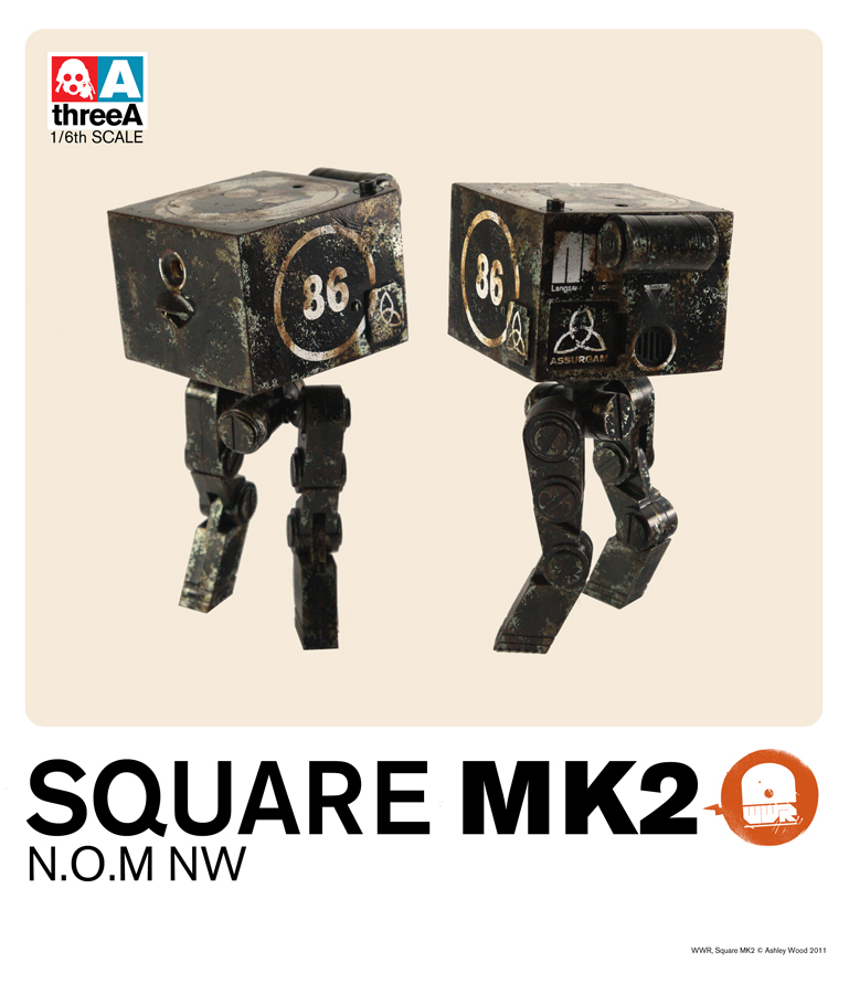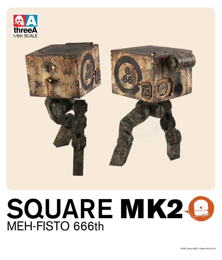 3A Toys' line of 1:6th scale Ashely Wood designed robots - World War Robot - expands with the latest incarnation of the Square, the MK2. The Square MK2 differs from its smaller cousin with the addition of much longer legs for running, jumping and kicking. It's two eyes have also been replaced with that of one.