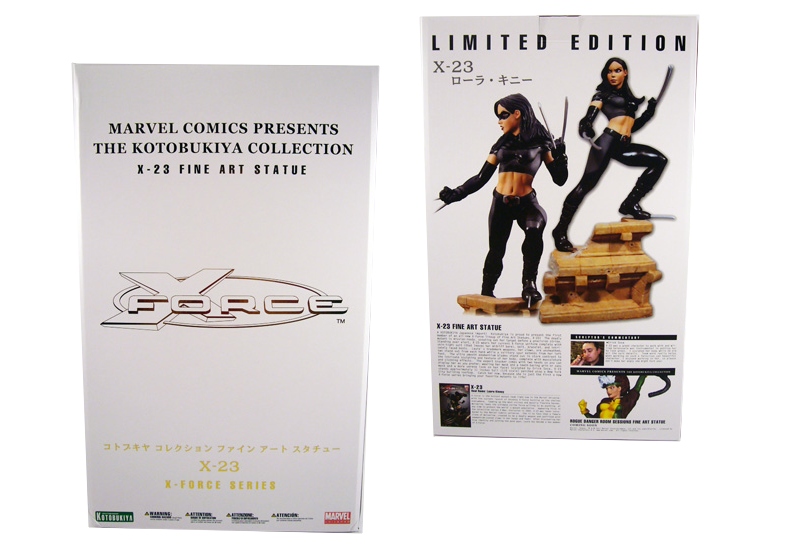 As usual, the artists at Kotobukiya have packaged their latest lineup in really sophisticated containers. X-23 comes in a tall, stark white box. The front panel features gold lettering with the name of the comic series, the statue series, and the character. At the bottom are multi-lingual warning messages and logos for Koto and Marvel. The two side panels have identical embossed X-Force logos with no painting; they’re a little hard to see unless you look closely but make for cool details. The back panel is the most lively, with two large images of X-23, a description of the statue, a character bio, some commentary from sculptor Erick Sosa, and a “coming soon” advertisement. The top panel includes the statue’s serial number. All in all the box has a minimalist approach that looks great.