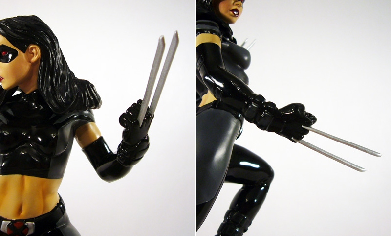 The statue comes with two easily swappable heads, and both of them look great with detailed long hair and comic accurate facial sculpts. While the unmasked version is definitely pretty with her large eyes, I have to say I’m partial to the other. With her mask on and her lips parted in an angry grimace X-23 looks fierce! Finally, it has to be noted that the base has an amazing sculpt as well with segmented concrete and tons of small details like bullet holes, broken chunks, and more.