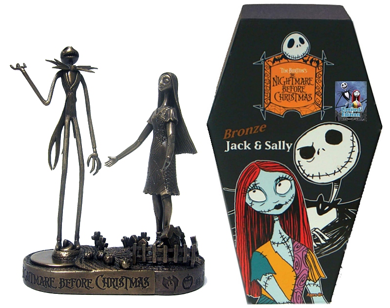 as more tempting exclusives are announced. One not to miss is the latest from Monogram based on Tim Burton's claymation classic, The Nightmare before Christmas. Starring Jack Skellington, the Pumpkin King of Halloween Town, and his beloved rag doll Sally, this set of finely crafted paperweights come cast in bronze. Jack and Sally can be displayed as two seperate sculptures or placed together for one stunning centerpiece.