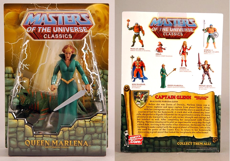Mattel shows off new packaged shots of Queen Marlena (pictured above - available at SDCC) and Captain Glenn (below - available after the show on Mattycollector.com). Both Masters of the Universe figures will have all the parts needed to make both outfits, but the bios and pack out will be different.