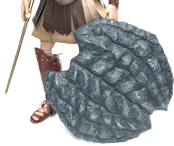 Overall, while the sculpt isn't perfect and the body leaves something to be desired in regards to articulation, the outfit and accessories (above) are truly the standouts of this collectible. The minute detailing on the faux leather skirt, chest armor and shoulder pads, the string ties on both the arm armor and greaves, and the sculpting on the chest armor, sword and shield all make this a beautiful display piece for fans of Tonner Character Figures and Perseus from the Clash of the Titans.