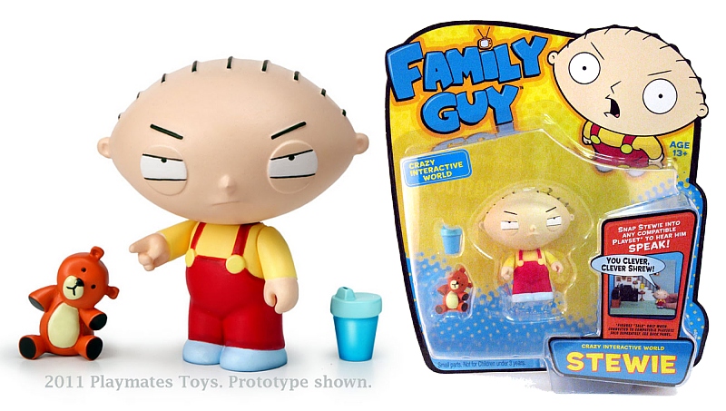 Each figure in the Family Guy Crazy Interactive World features a resistor that, when placed on the compatible playset, unlocks the real character voices and more than 40 phrases from the show. When the line hits retail this fall it will include some of the show’s most popular characters – Stewie, Peter, Brian, Cleveland, Quagmire and Lois – with additional characters and environments coming in Spring 2012. Also available from Playmates Toys in the fall will be a 7-inch soft foam Stewie ‘head shaped’ Football (pictured above).