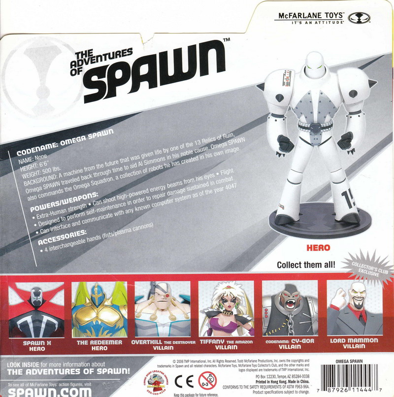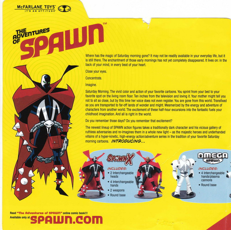 While the idea of Spawn as a Saturday morning cartoon turned off many fanboys, this collector found the concept very refreshing. To me, any hard-edged, mature property transformed into something soft and cute has a certain appeal to it. It's like you can't comprehend what you're seeing. The Adventures of Spawn toy line didn't exactly push this concept to the extreme; there wasn't a cartoony Violator with a decapitated head for example (which would have been cool IMO). But the simple animated look of the characters was creative, figures like Omega Spawn and Creech being two of my favorites.
