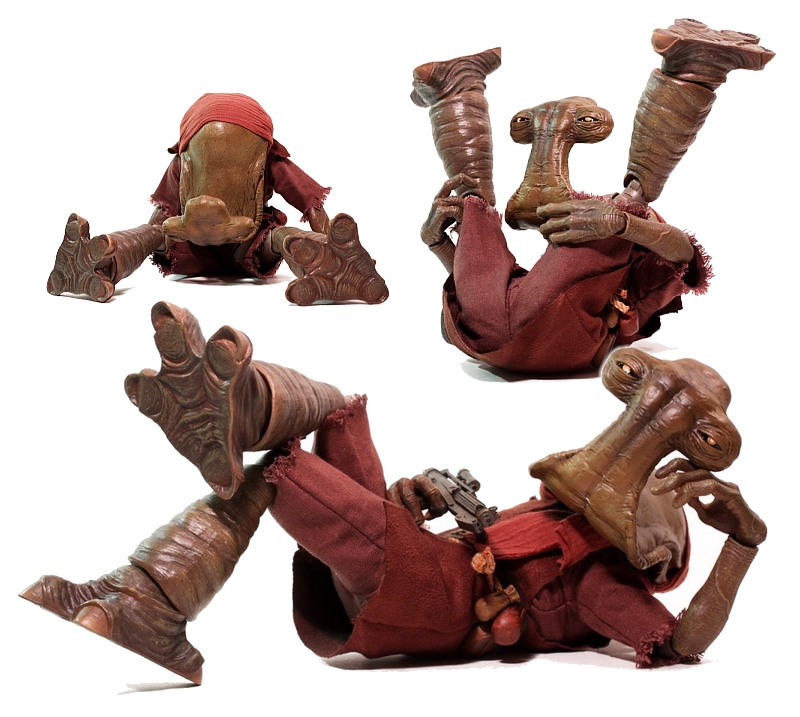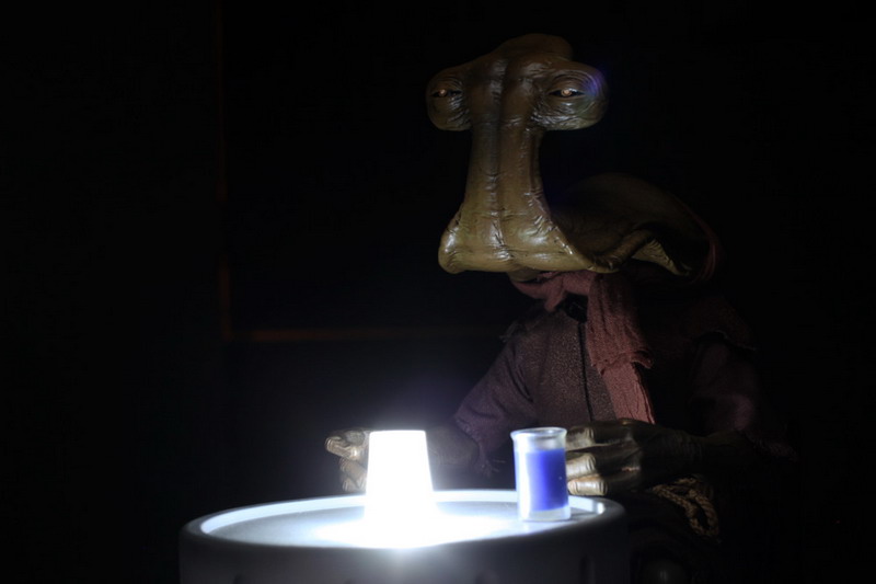 Momaw Nadon’s outfit is a detailed bodysuit, tunic, and scarf which includes a rope belt as well as a regular belt complete with herb pouch and bread bag. The goodies on his belt are just for show and don’t actually contain anything. Momaw Nadon also comes equipped with a E-11 Stormtrooper Blaster, and Display Base with Star Wars Logo. The display stand follows the Hot Toys model of cupping the figure underneath the unmentionables rather than grasping around the waist, a better direction in my opinion. There’s also two additional right hands, one great with the blaster, the other great with the staff. Now, if you’ve picked up the standard issue Hammerhead, you don’t get the Ithorian staff.