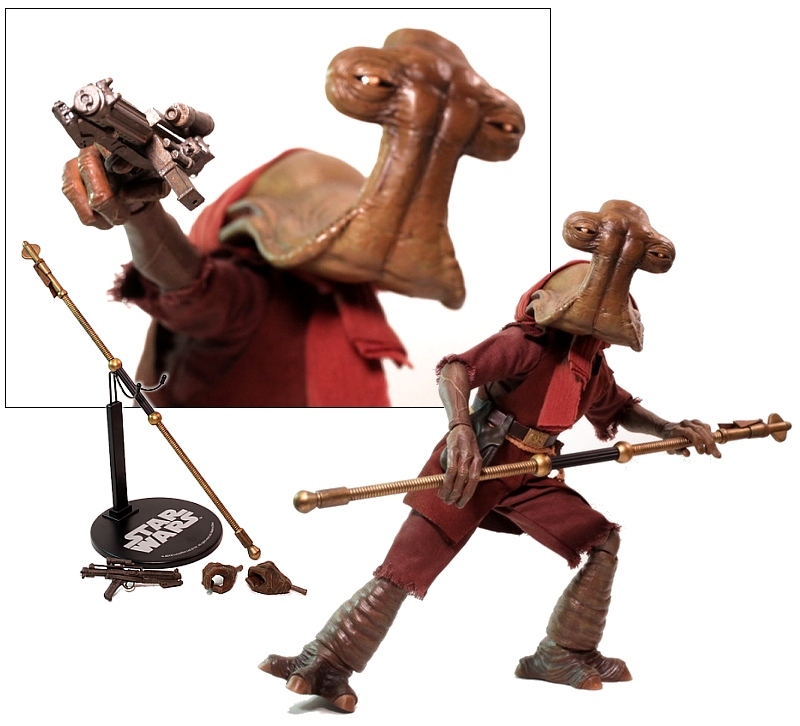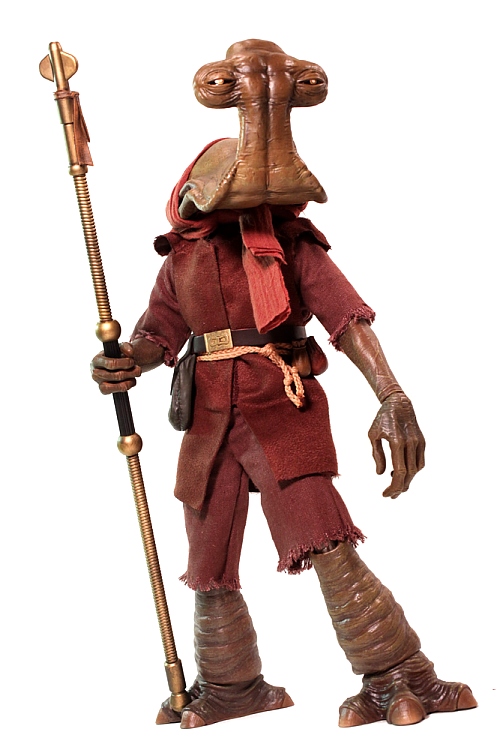 Momaw Nadon, part of Sideshow’s 12” Star Wars collection, is an Ithorian alien and available right now at Sideshow’s website. The standard release is on the Wait List but you can still get the exclusive (reviewed here) for $124.99 (CLICK HERE to order). Limited to only 850 units, the exclusive version comes with an Ithorian Staff accessory unavailable anywhere else.