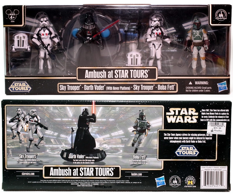 The attraction features two different openings so you may or may not get Darth Vader ambushing your Starspeeder 1000. The other opening just uses standard Stormtroopers which you can buy in mass at retail stores. The opening featuring Lord Vader features four Sky Troopers and a legion of Stormtroopers at his disposal. A Rebel Spy has been spotted on board and Vader, riding his hover platform, attempts to stop us from flying off, which of course we do. Boba Fett is the odd-man out in this set as he is only seen in his Slave 1... IF your journey takes you to Geonosis.