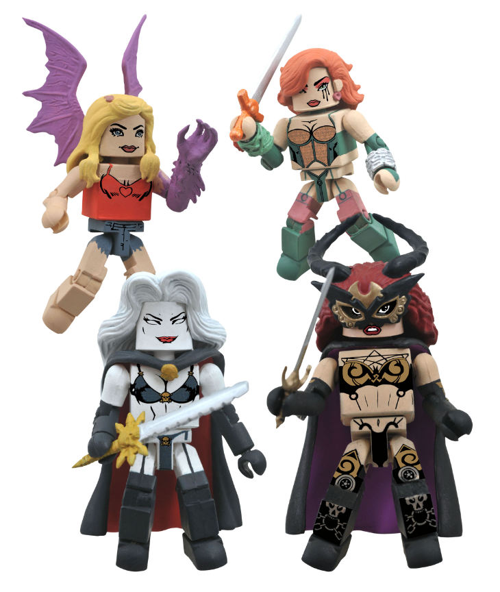 Set 1 (pictured top) features comic book luminaries Lady Death, Darkchylde, Tarot and Dawn, while Set 2 (below) showcases some of DST's own character designs: Anne Bonny, Medusa, Alice and Little Red. All stand 2 inches tall with 14 points of articulation, and all are compatible with existing Minimates lines like MAX and Pirate Raiders.