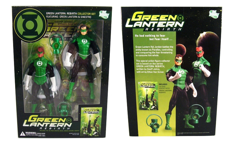 Much has been said about this summer’s Green Lantern film and the products it has spawned, most notably the 4 inch and Movie Masters lineups from Mattel. But this summer also saw more Green Lantern comic book-related toy releases, including a superb two figure set that’s perfect for anyone just getting into the comics. Out now from DC Direct is the Green Lantern Rebirth set that includes new figures of both Hal Jordan and Sinestro as Green Lanterns, along with the new paperback version of the now classic Green Lantern: Rebirth storyline.