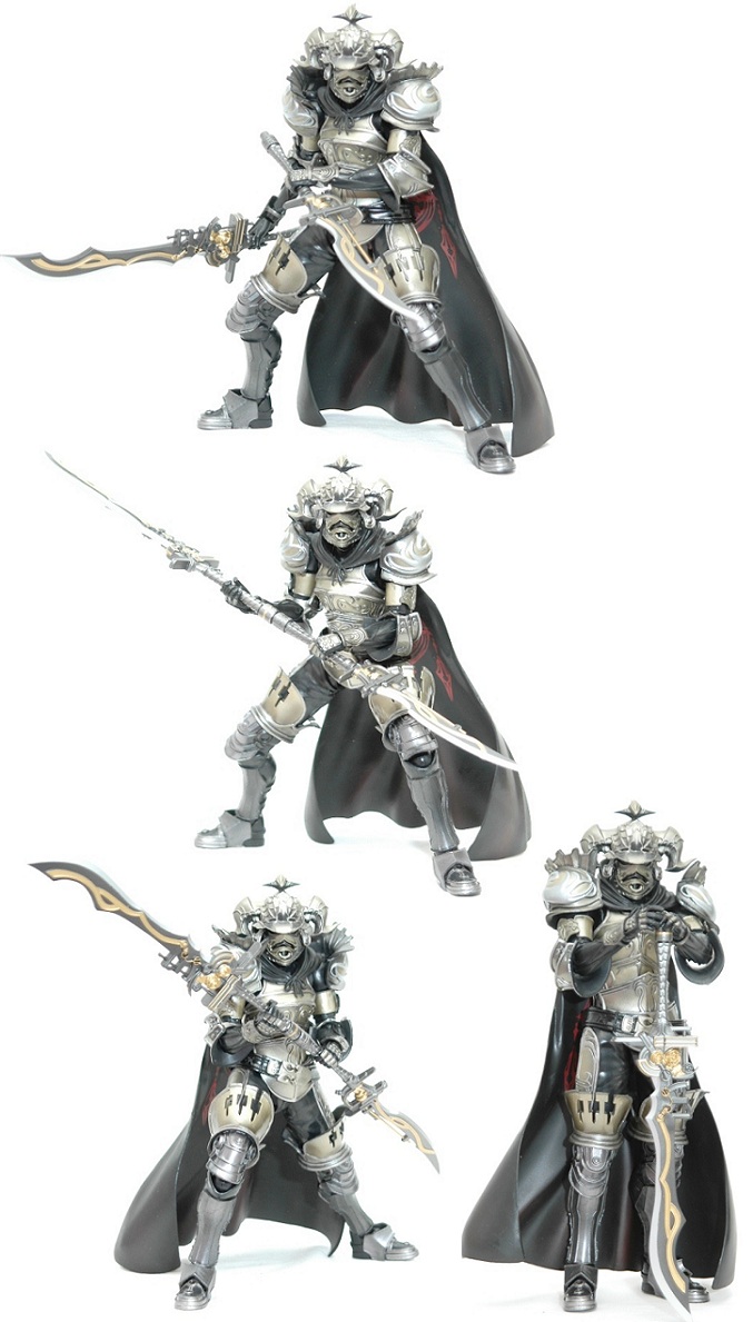 Unlike the previous two figures, Judge Master Gabranth (JMG from here on) is completely armored in an intricate, layered suit of armor the likes of which will both impress and intimidate any foe he faces. The ornate, detailed helm cover the warrior's face while a large chest piece and shoulder plates give the character his imposing look. The gunmetal armor is accentuated by gold detail lines, which give the armor depth and detail. Likewise, the black pants and over-the-shoulder cape worn by the warrior help break up the armor and frame his large, armored body.