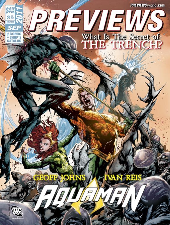 The front cover of the September PREVIEWS showcases DC Comics’ AQUAMAN #3 (above), which continues the new series from writer Geoff Johns and artist Ivan Reis, the creative team behind an acclaimed run DC’s Green Lantern and the Eisner Award-nominated Blackest Night. Launched as part of DC’s New 52 publishing initiative, Aquaman has seen the hero attempting to fend off cannibalistic sea creatures and unravel the mystery of the Trench. In this issue, the secret is at last revealed.