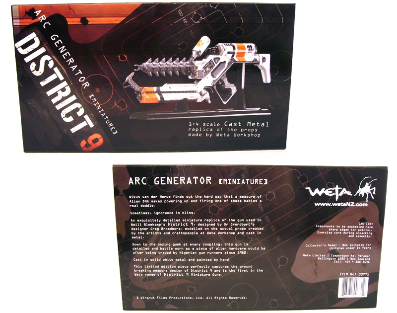 The Arc Generator comes in a really nice box. Glossy black, it has plenty of violent background images of “Prawn” shooting range targets and anti-alien propaganda. Superimposed over that is photography of the weapon on the front and top panels, along with the title and logos for the film and Weta. The front describes the Arc Generator as a “1:4 scale cast metal replica of the props made by Weta Workshop.”