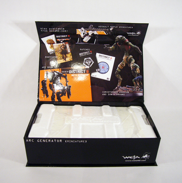 On one side of the box is the gun’s limited edition number (out of 750), and on the other are its dimensions. The back panel has a brief teaser about the film’s plot and a description of some of the weapon’s features. But that’s not all. The front panel, held in place by magnets, flips up to reveal other District 9 products from Weta.
