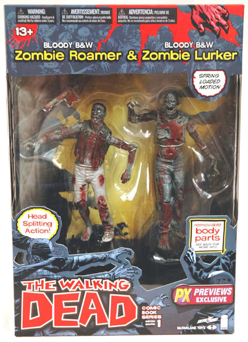 Packaged photos for McFarlane's upcoming Walking Dead Zombie 2-pack have been revealed. Exclusive to Diamond's PREVIEWS catalog, this set features Roamer and Zombie Lurker action figures both with a unique bloody black and white color scheme.