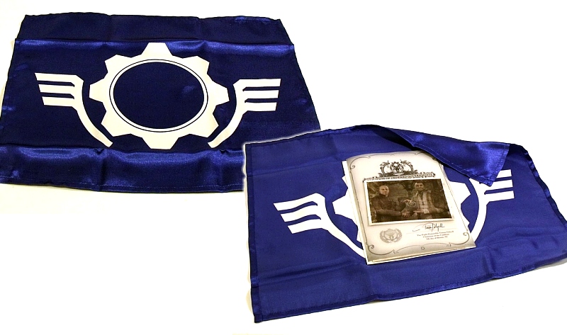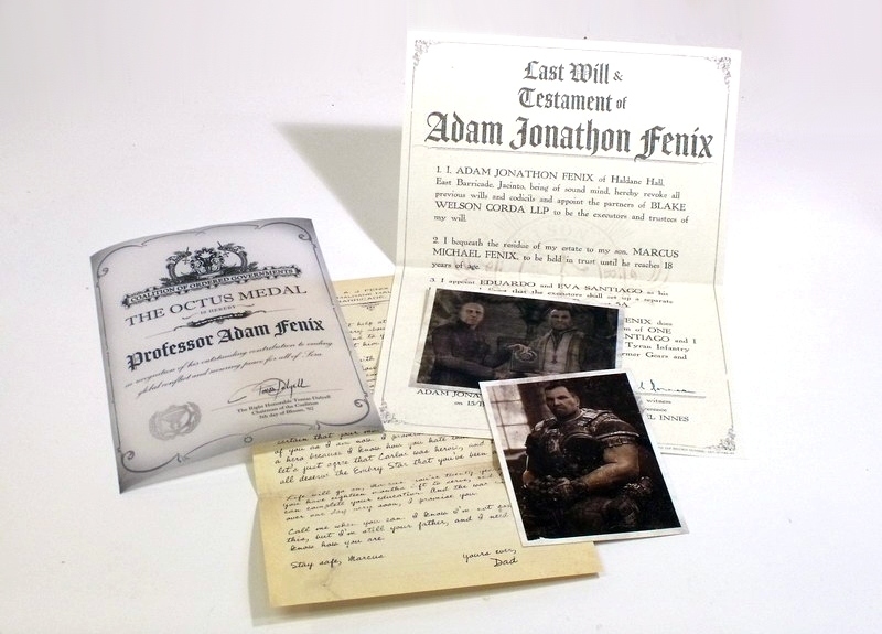 Unfurling the flag reveals yet more GOW goodness: the Personal Effects of Adam Fenix. I haven't read these yet, but Epic did a nice job on making the paper replicas look weathered and authentic. Good paper stock too (though the Octus Medal certificate is made of clear plastic).