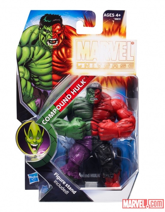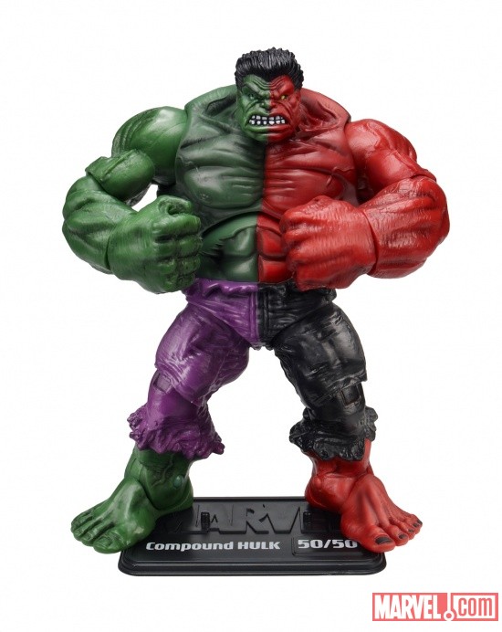 Marvel.com unveils a new Hasbro Marvel figure that will be offered exclusively at New York Comic Con: A Marvel Universe "Compound" Hulk. The figure, inspired by HULK #30, features the Hulk split between both his altered states of Green AND Red. It will retail for $11 at Booth #302,as well as through HasbroToyShop.com.