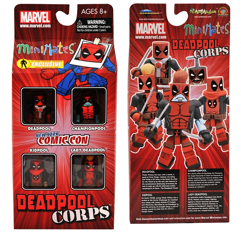 DST provides a packaged look at one of their New York Comic Con exclusives: The Deadpool Corps. This Minimates exclusive set will be offered for sale at the Action Figure Xpress booth (#958), October 13-16, priced at $20.