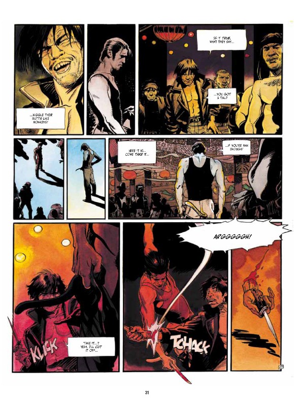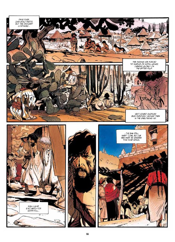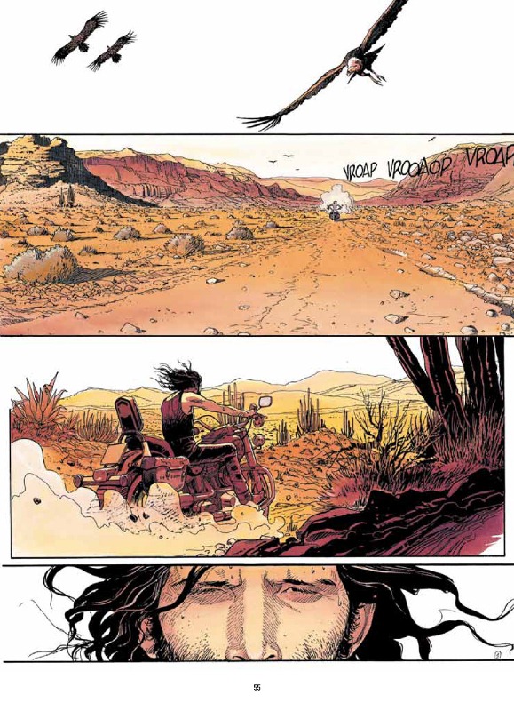 In respect to the artwork, Bess does an outstanding job of bringing to life Jorodowsky's character-driven script. Whether it's the character designs - specifically the Boss' henchmen and wife, whose looks give their personalities meaning, or the scenery, including the dank and dirty slums of the city and the scorching desert (above & below), Bess' artwork captures these all with amazing detail and realistic style. Likewise, the use of panel design helps move the story seamlessly between setting and time, ensuring readers never feel out of touch with the tale of Juan Solo and his violent rise, tragic downfall, and graceful redemption.