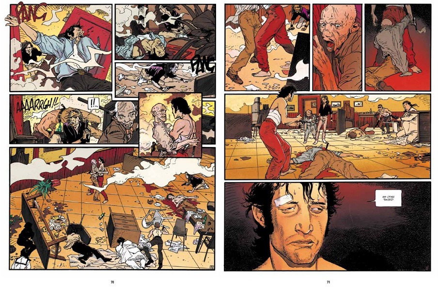 Joroowsky's characterization of Juan as a loyal, angry brute willing and able to do anything is likewise perfect for the tale as Juan proves, through various actions which must be seen to be understood, he's dedicated to not only be accepted, but exalted amongst his peers. As a reader of this terrific tale, I was astonished at how much I loved Juan's character and yet hated him for all the sadistic things he had done (including decapitating his Boss' political opponent, p.58 above and killing his fellow bodyguards for leadership, p. 70 & 71, below).