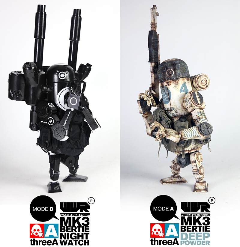 Three A Toys is now accepting orders on the next evolution of the Bertie: the MK3. This larger and more heavily armed Word War Robot Portable (WWRp) action figure, designed by Ashley Wood, comes in two flavors: Night Watch and Deep Powder.