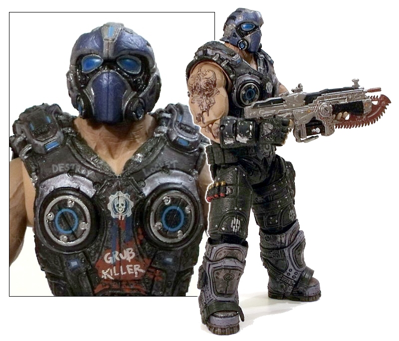Clayton is a whole other story, the last of the Carmine brothers ripped and looking totally badass. By far my favorite Gears figure produced, Clayton bristles with coolness - from his awesome COG helmet (I have a weakness for helmeted, faceless sci-fi charcters) and personalized armor ("Grub Killer") to his intricate arm ink (bullets and a tribute to his lost brothers) and skull adorned knee guards. Carmine comes with the chainsaw Lancer, a weapon that actually fits his hellbent lust for revenge on the Locusts. I gave him the Retro Lancer, however, my favorite new weapon for my favorite new figure.