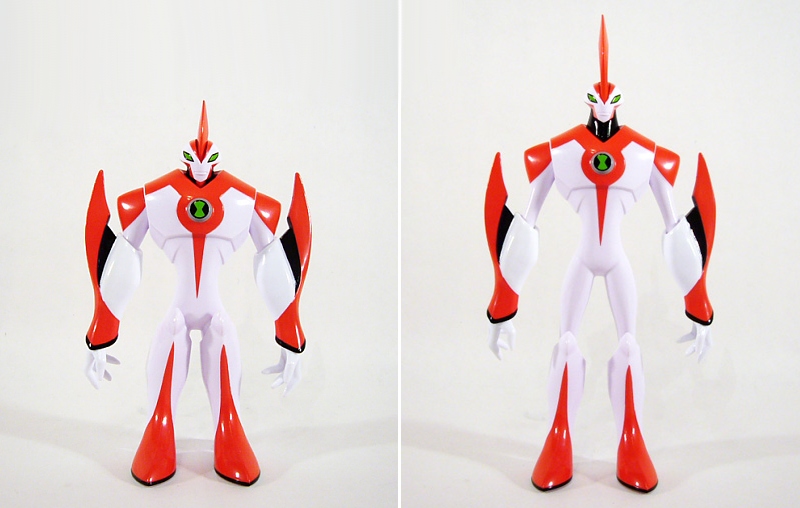 Way Big’s sculpt is about as good as expected for such a visually simple character. There’s a tiny bit of muscle/anatomy definition with details here and there like kneecaps, layered glove fins, and the head. Except for on the boots there are sculpted lines wherever colors meet which is cool. Speaking of colors, Way Big is primarily white with red on his extremities. Black outlines the feet, gloves, fins, and neck while green appears on the Omnitrix and Way Big’s eyes.