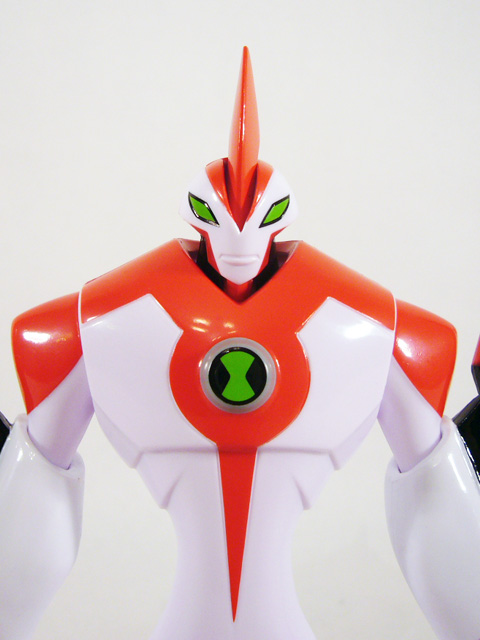 Ben Tennyson is an impulsive kid with... let’s say limited creativity at times. And so it was that the first time he turned into the gigantic alien he called it as he saw it, naming the transformation “Way Big.” Naturally giant, Way Big appears to be from 100 to 200 feet tall, possibly with the ability to regulate his size at will. With that great size comes corresponding strength, and other powers like super speed and energy blasts. Way Big has a basically humanoid shape with a lean body and long thing limbs. His combat suit has built in heavy boots and long gloves with reinforced forearms and fins. In the center of his chest is the Omnitrix, and his alien head has slanted diamond-shaped eyes, no nose, and an enormous vertical fin. Way Big is very stylish (and further connected to Ultraman) with a bright white and red color scheme.