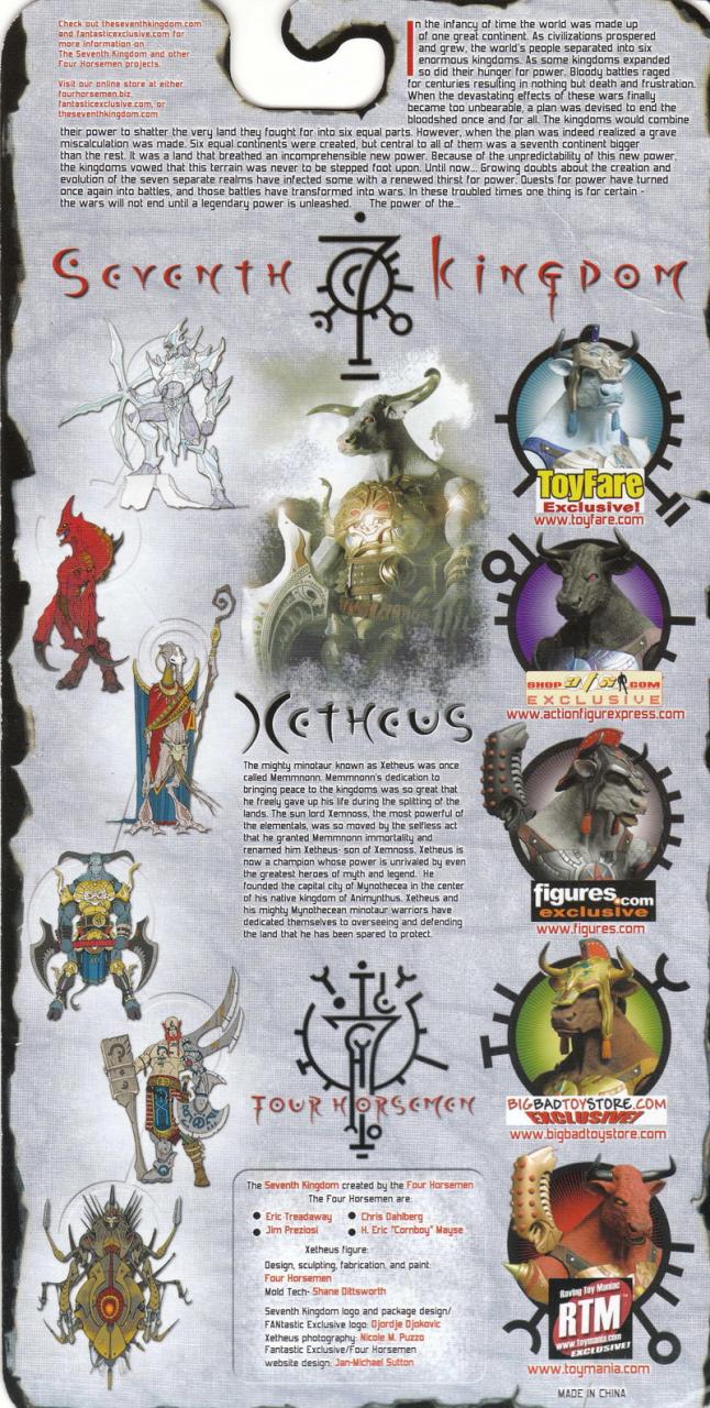 The first release in the Four Horsemen's ambitious FANtastic Exclusive project was the Mynothecean Six. An original Four Horsemen creation, the action figure depicted a mighty minotaur warrior from the Seventh Kingdom released as multiple retailer exclusive color variants. Figures.com joined in the fun by offering fans the "Keeper of the Black Labyrinth," the hoofed soldier featuring cool black armor and weapons.