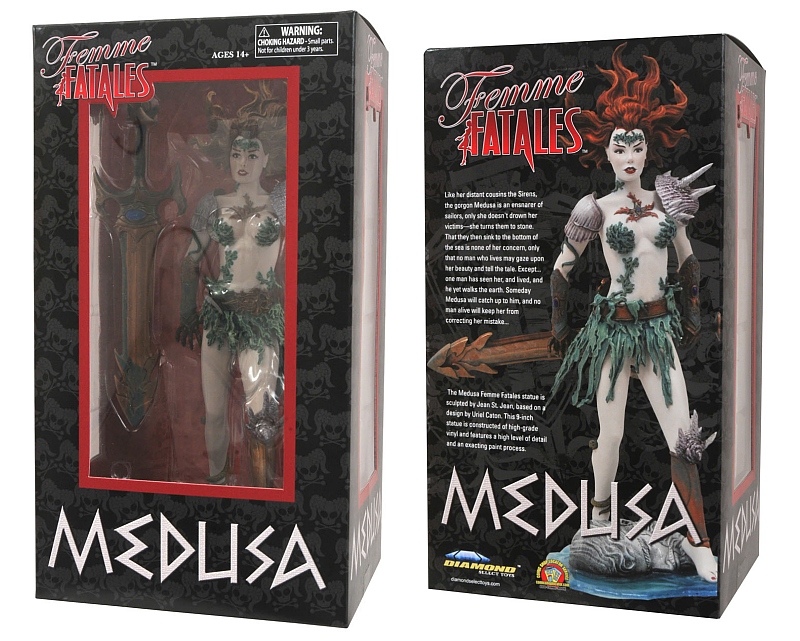 Unlike the stone-turning gaze of the mythological creature she's based on, this 9-inch Femme Fatales statue of Medusa is made of PVC vinyl... so go ahead and stare at her all you want. DST even put a convenient viewing window in the front of her packaging, shown here for the first time. Look for the Femme Fatales Medusa in a comic shop or specialty store near you in December. Medusa will also be making an appearance in Minimate form in January as part of Femme Fatales Minimates Series 2.