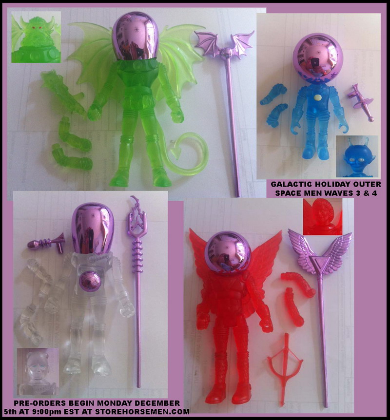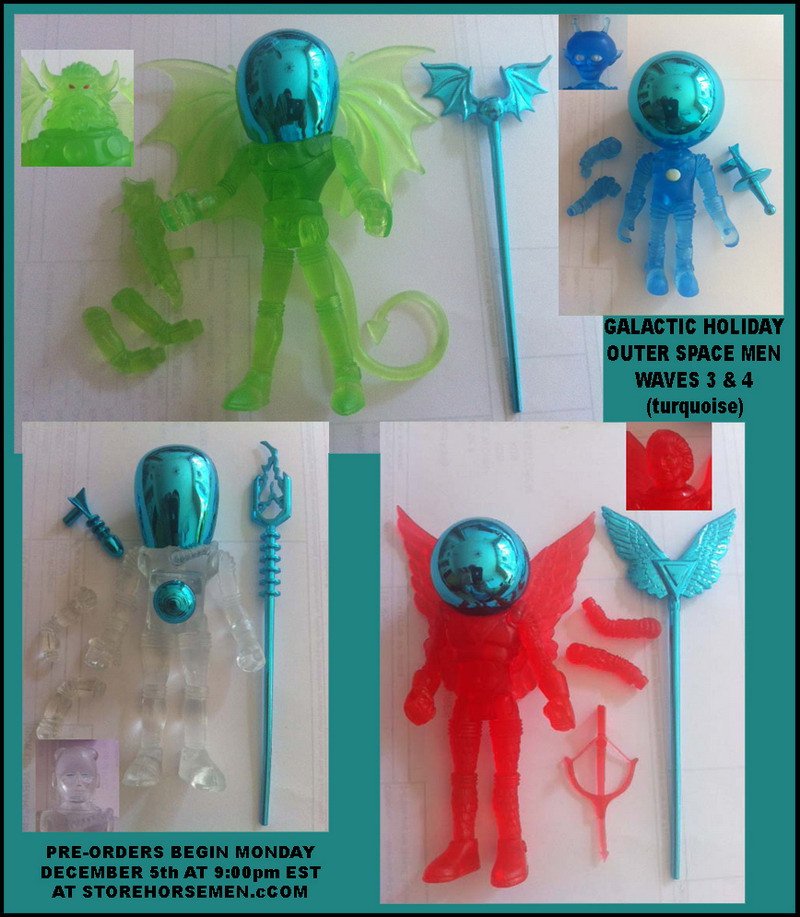 The Four Horsemen are now accepting pre-orders at Store Horsemen for Waves 3 & 4 of the Galactic Holiday Outer Space Men. This set includes the Galactic Holiday Edition versions of Mystron, Commander Comet, Electron+ and little Alpha 7 all in one complete set, each with their own character specific accessories including some that are done in festive & reflective vac-metal holiday inspired colors. This time around, you'll be able to choose from lavender accessories, turquoise accessories, or randomly inserted lavender and turquoise accessories.