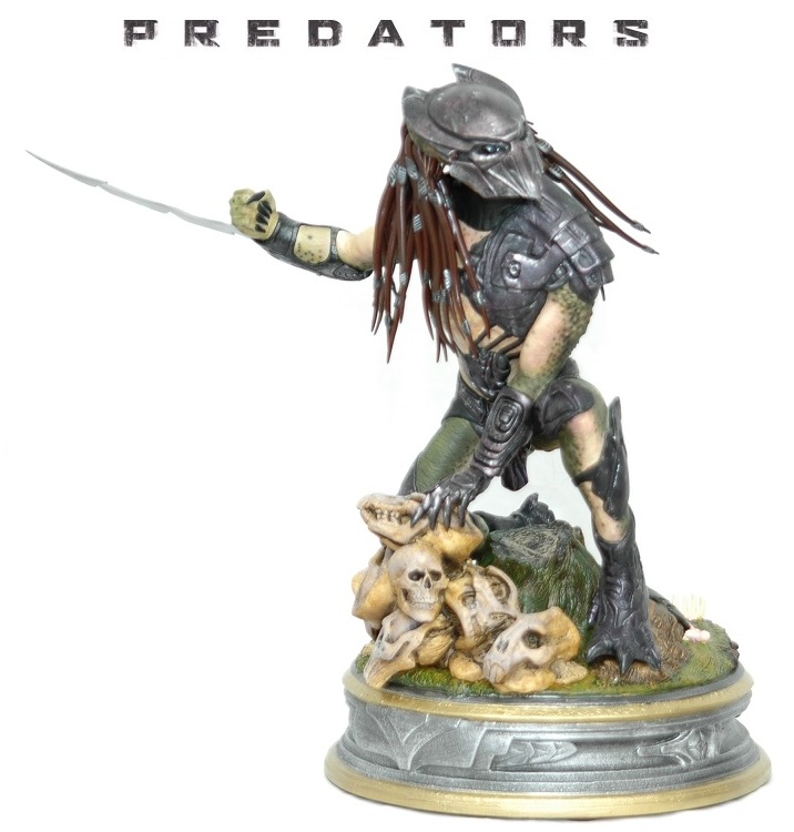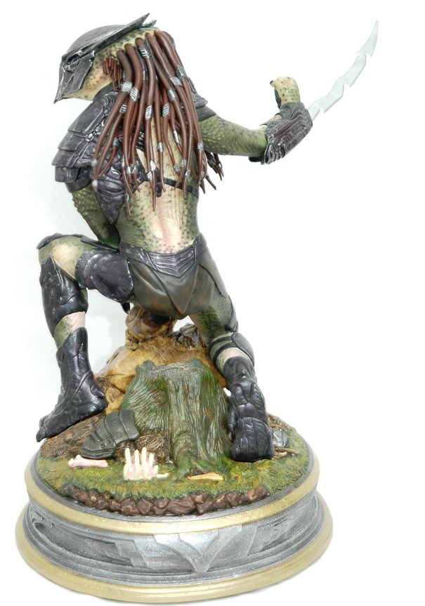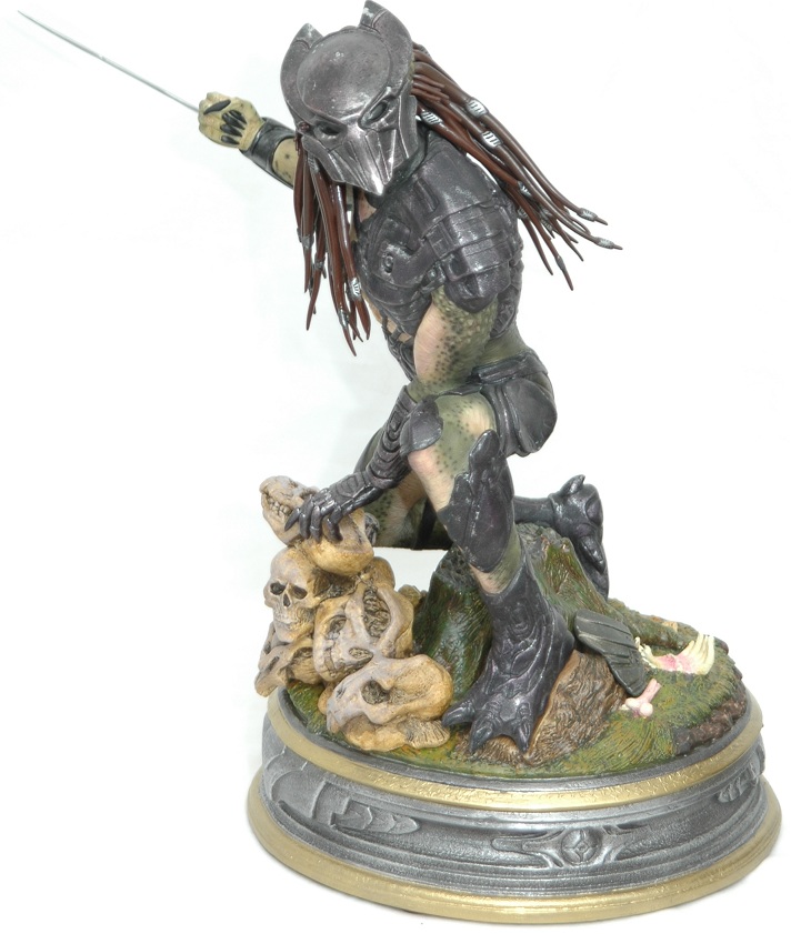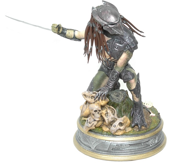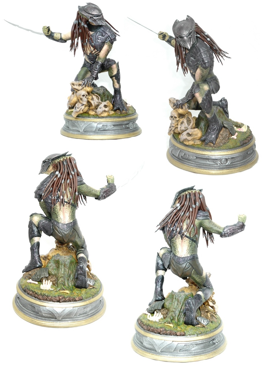 The Falconer Maquette stands 14.5" high, 16" wide, and 14" deep in a crouched position atop a base covered with foliage, bones, and skulls (above). Made of durable polystone and constructed in four pieces - base, body and limbs, head, and right blade arm - the statue's dynamic pose and beautiful detail work instantly catch the eye and ensure it receives attention. This makes it a gorgeous addition to any die-hard Predators fan's collection.