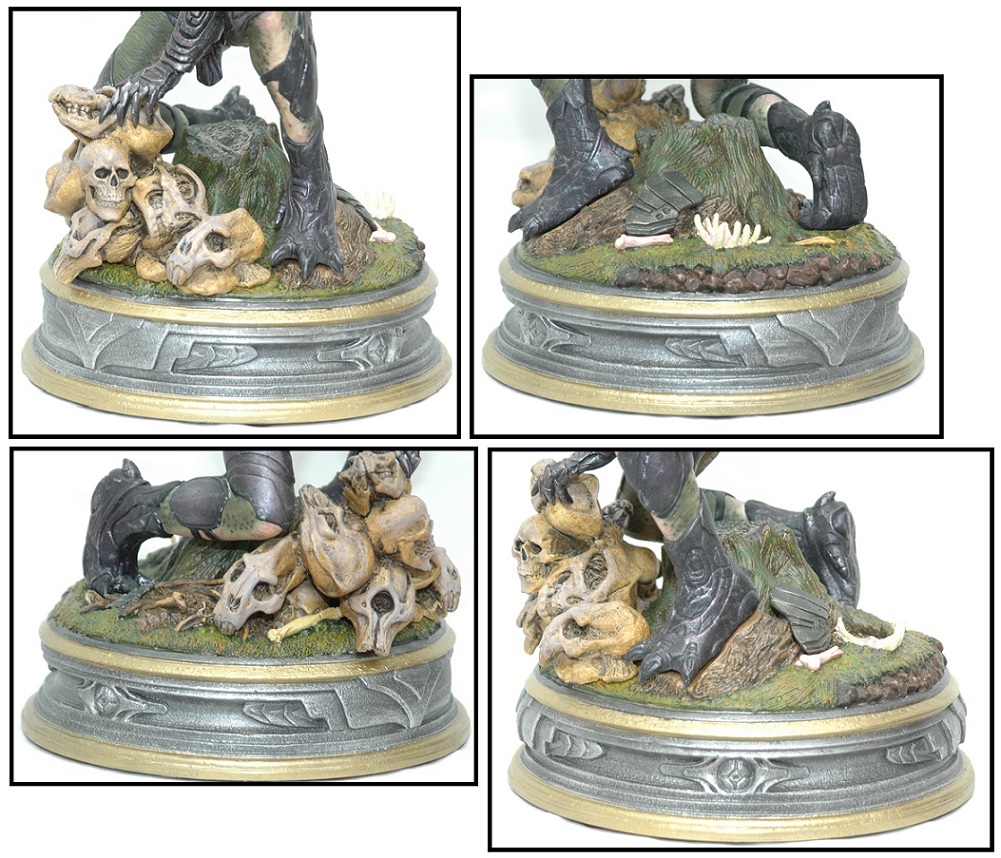 Something of note is the detail included in the base (above, further below). The base alone is a work of art, with loads of detail included. Be it the pile of skulls upon which The Falconer crouches (no doubt his trophies from various hunts) or the detailed grass, broken armor pieces, or even freshly mangled body parts (below), it all helps make this a gorgeous statue.