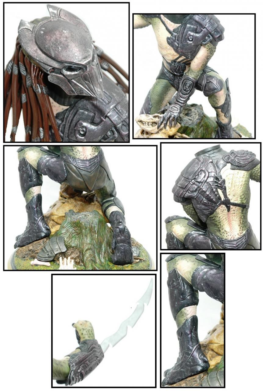 Larger than the 1/6 scale Hot Toys figures but smaller than the 1/4 scale Predator statue, The Falconer Maquette is approximately 1/5 scale and makes for a great display piece for those with a decent-sized shelf, table, or flat space. The sculpting is brilliant with the minute scales of the warrior's skin perfectly captured, the multi-part armor of the hunter's suit exquisitely detailed, and the various interest points - including the bladed gauntlet, the mask, and the leg armor (above, below)- all drawing the eye and attention.