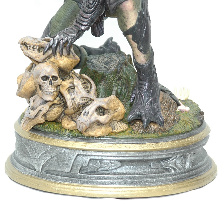 The Falconer's sculpt is only further complimented by the impressive paint application, which includes the matte silvers from the warrior's armor and weapon and the subtle greens, browns, and tans from the creature's skin and body. The reptilian body especially is impressive and every minute detail has been included in the armor as well - from the bright silver nicks from battle damage to the silver ringlets around the dreadlocks. Likewise, the base features gorgeous colors which help bring to life the beast standing atop it. From the yellowing shades on the skull trophies, lush green grass, and flesh still clinging to the torn-apart ribcage of the warrior's food, the base too is, as previously mentioned, a work of art.