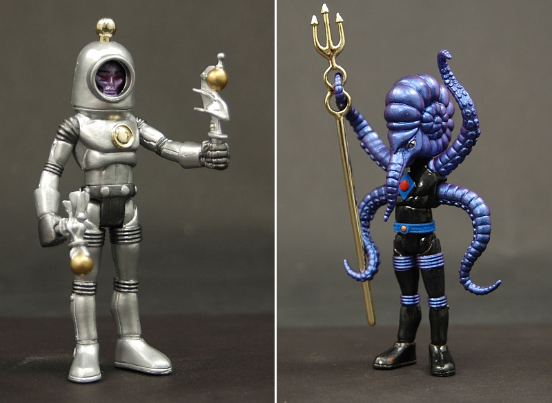 The Four Horsemen are expanding their popular series of Outer Space Men action figures with a new Cosmic Creators Series. The first in this special series will be The Birnkrant Edition, figures from OSM Wave's 1 and 2 with re-imagined paint work by original OSM creator himself, Mel Birnkrant. Pictured is a look at two of these re-designed figures: Metalmorpho and Deep Blue Astro-Nautilus.