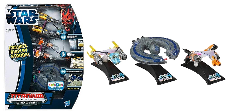 * Hasbro Star Wars TITANIUM SERIES DIE-CAST 3-Pack (pictured above) - This exclusive set features ANAKIN SKYWALKER'S PODRACER, SEBULBA'S PODRACER and a TRADE FEDERATION BATTLESHIP.