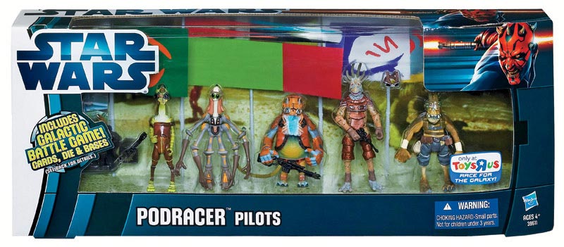 * Hasbro Star Wars PODRACER PILOTS (below) - This set of action figures collects five of Anakin's Podracing competitors, DUD BOLT, CLEGG HOLDFAST, GASGANO, MARS GUO and TEEMTO PAGALIES complete with flags, flagpoles, 5 battle bases, 5 Galactic Battle Game cards, game dice and additional accessories.