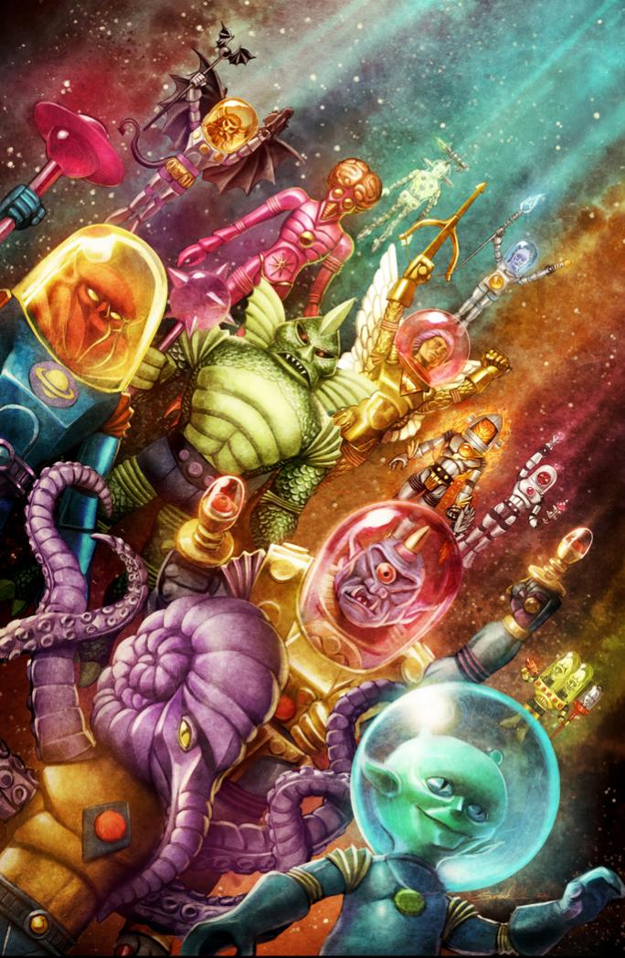 Painted by fan favorite artist and frequent Four Horsemen collaborator, Nathan Baertsch, this 11" X 17" image on high quality, uncoated, heavy card-stock is Nate's vision of the Outer Space Men originally created by designer Mel Birnkrant back in the late 60's.