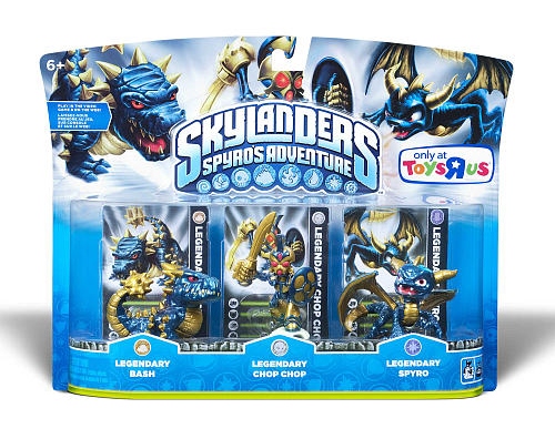 The Skylanders Spyro's Adventure Legendary Triple Pack is exclusive to Toys "R" Us and features Legendary Bash, Legendary Chop Chop and Legendary Spyro. All three Legendary characters have stat boosts not available to their standard counterparts.