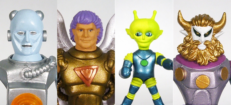 Of course, since they’re based on 60’s era ideals of “astronauts” they all have giant bubble helmets to protect them in outer space! Each one also has unique weaponry that matches its overall design ranging from ray guns to staves and more. In Series 3 you’ve got the angelic Commander Comet (the man from Venus) and the demonic Mystron (the man from Hollow Earth), while Series 4 brings you the cyborg Electron+ (the man from Pluto) and “little green man” Alpha 7 (the man from Mars).