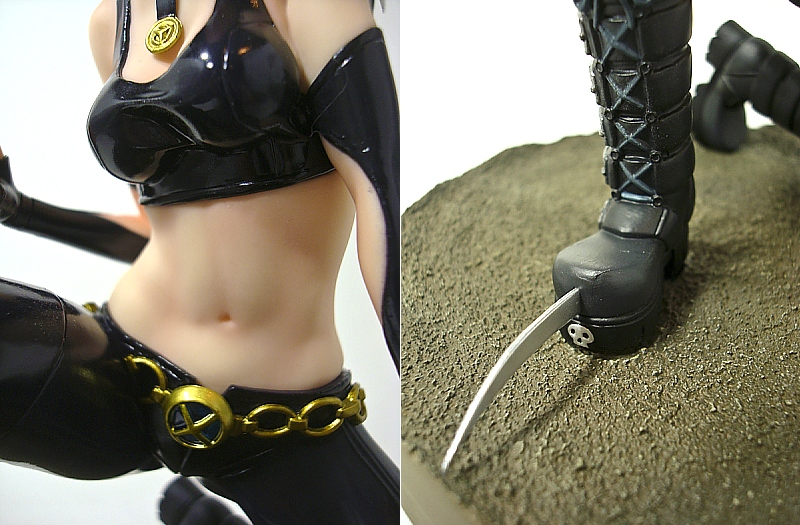 Kotobukiya sculptor Takashi Tsukada translates Shunya’s artwork to figure form, putting his own spin on the illustrator’s work. X-23 is posed crouching down on one knee, with claws unsheathed and at the ready as her hair blows in the wind. She comes in at around 6 inches tall (1/7 scale), although she appears much bigger in scale than many of the characters in the Bishoujo line.